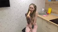 In a dimly lit kitchen, the sight of her braided hair cascading down her shoulders sent shivers down his spine as she bent over the cold marble countertop.Her tattooed arms adorned with intricate designs, reaching out like branches in a forest, creating an image that only amplified her sensual appeal.As she pulled on her socks and stockings, her legs trembled in anticipation of their impending adventure.The moment it was in place, the tattooed beauty began riding the dildo, her eyes closed as waves of pleasure washed over her body.The sound of flesh meeting plastic reverberated throughout the kitchen.She moaned softly, lost in the sensations, as her fingers found their way between her legs to tease and caress her swollen folds.Her partner stood behind her, unable to resist joining the passion-filled scene.His hands roamed her body, kneading her breasts and teasing her erect nipples.With each thrust of the dildo into her core, she ground against his hand for added pleasure, gasping at the intensity.Their moans grew louder, filling the small space with a symphony of lust and desire.The scent of their passion filled the air, intoxicating them both as they lost themselves in the heat of the moment.Her socks and stockings rubbed against her legs, heightening every sensation.With each thrust, her body began to convulse, her orgasm building like a tidal wave, ready to crash down upon her.He sensed the approach, and his fingers pressed harder against her swollen clit.The moment she shattered, her muscles clenching around him in release, he found his own climax burst forth in a warm, gushing explosion.As the waves of pleasure subsided, they both collapsed onto the floor, panting and entwined, basking in the afterglow of their passion.The dildo was left between her legs as evidence of their tryst, and the scent of their lovemaking lingered in the air, a memory to carry with them.Each detail of the experience was forever etched into their minds - the sight of her braids cascading over her shoulders, her tattooed arms framing her delicate form, and the feeling of her stockings rubbing against her trembling legs as she ground herself against him.This unforgettable night of pleasure would become a cherished memory that would fuel their passion for years to come.